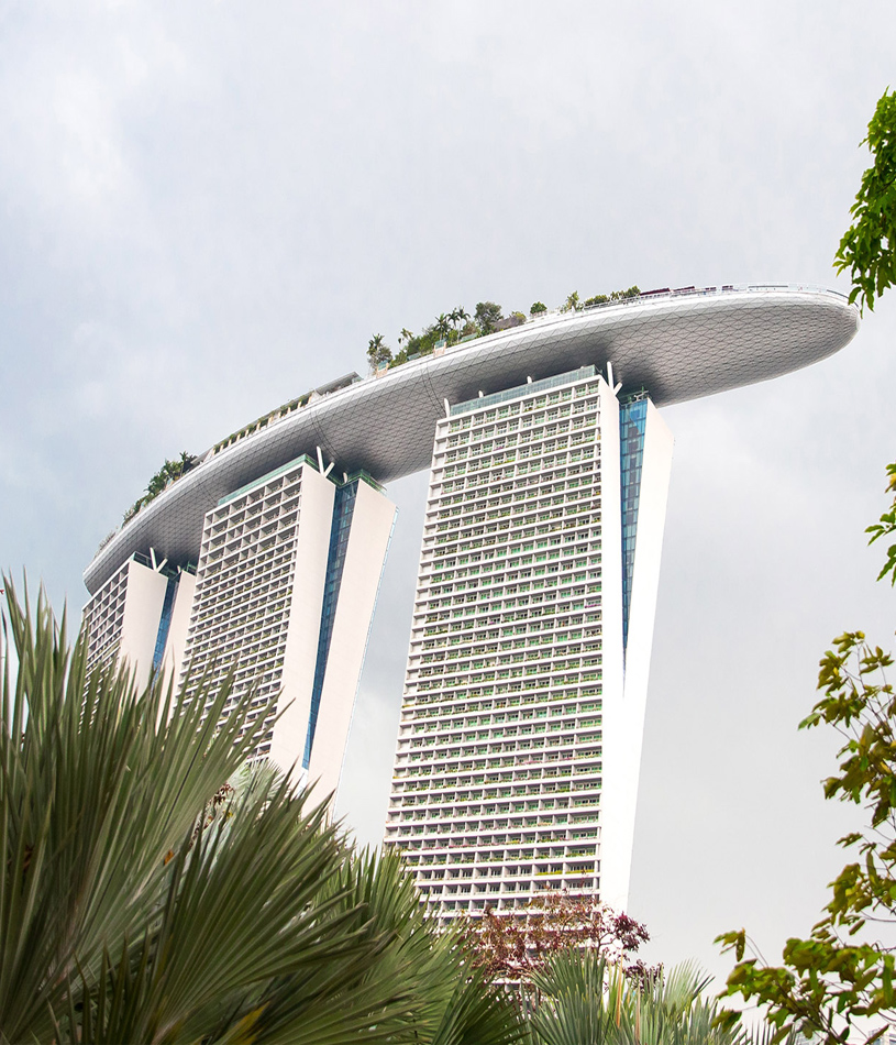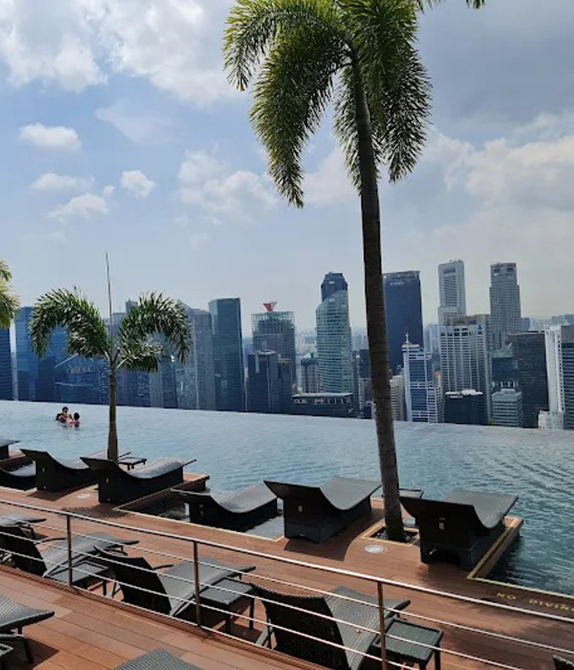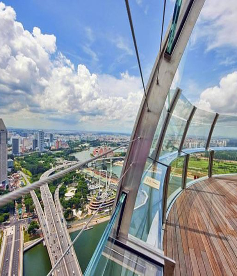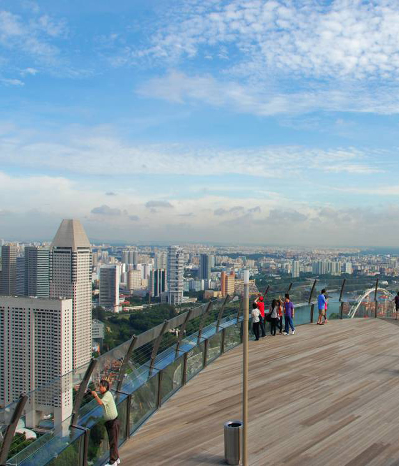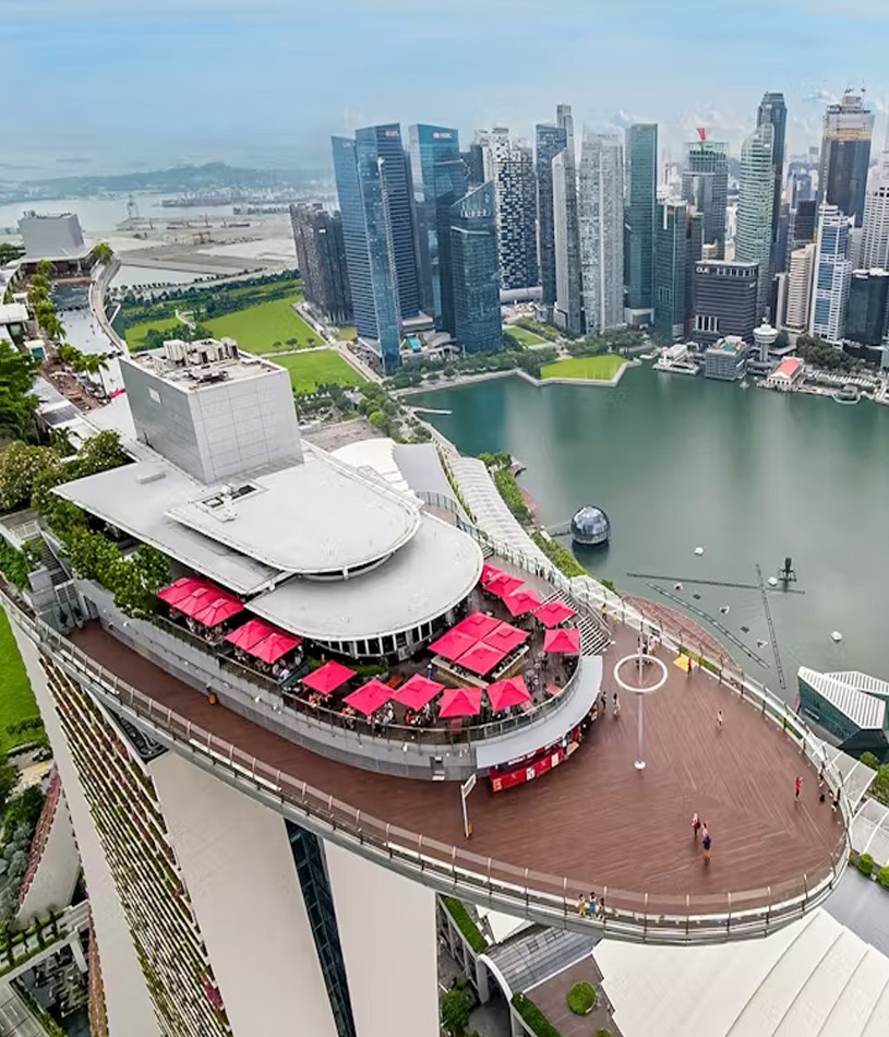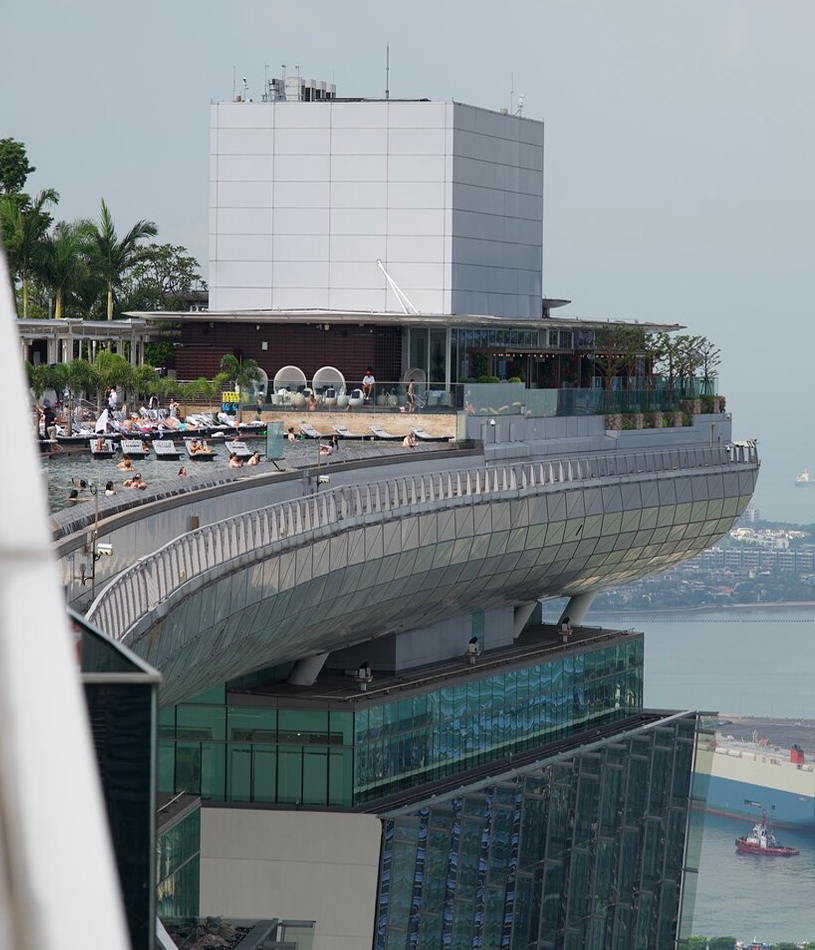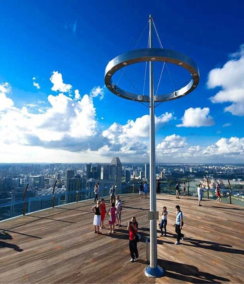 - تماشای بهترین چشماندازهای سنگاپور شامل خلیج مارینا، گاردنز بای د بی و درختان غول پیکر از روی سکویی به شکل تخته موجسواری که ظرفیت چهار هواپیمای ایرباس A380 را دارد.